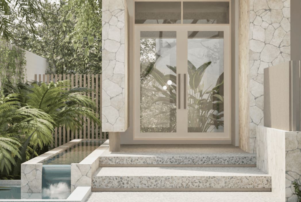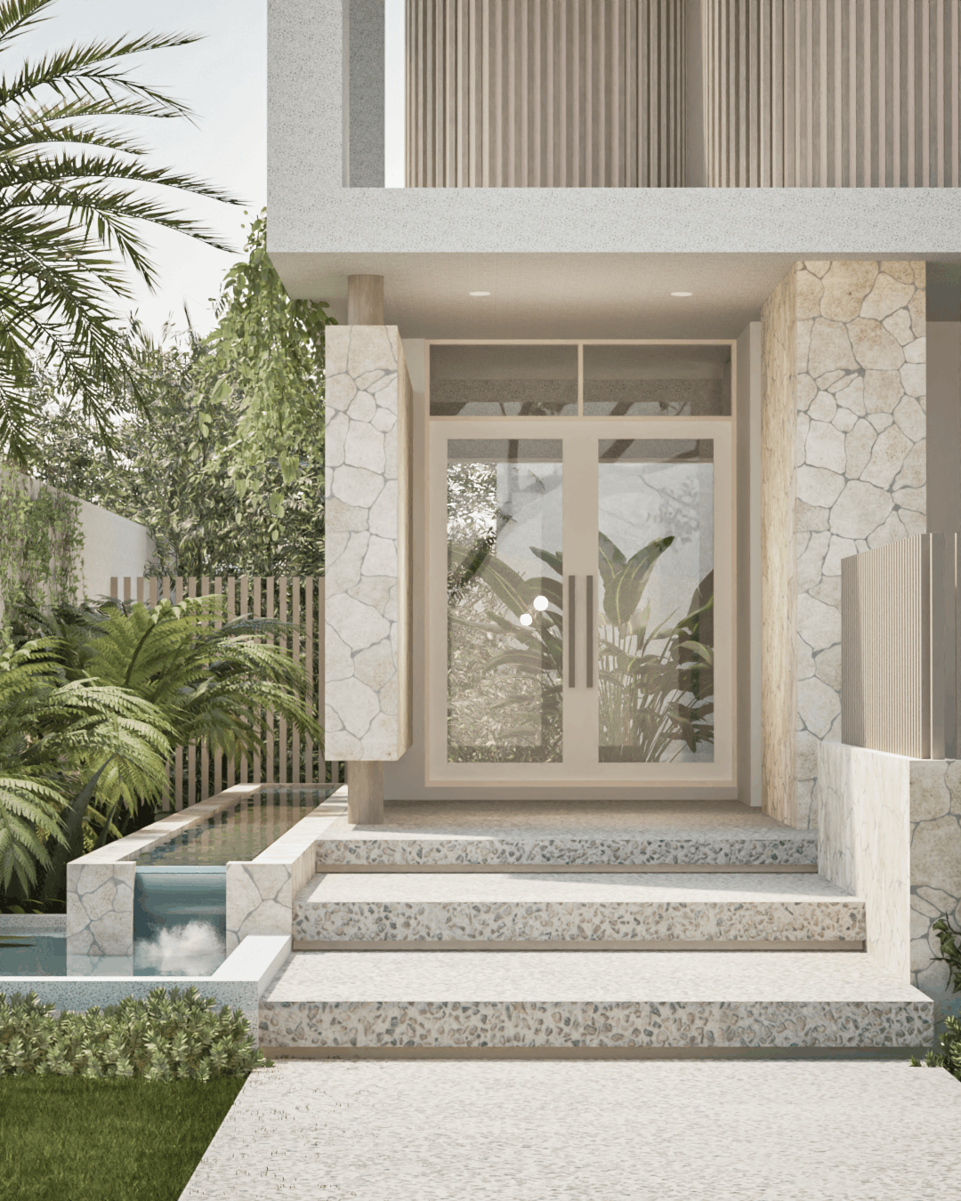 Guests arrive from the street via a landscaped path to a stone-clad entry and glazed double doors, opening to a feature window overlooking the courtyard. A private guest wing at the rear allows visitors to come and go independently, without disrupting the main living areas, an approach typical of a luxury home builder focused on both liveability and long-term value.