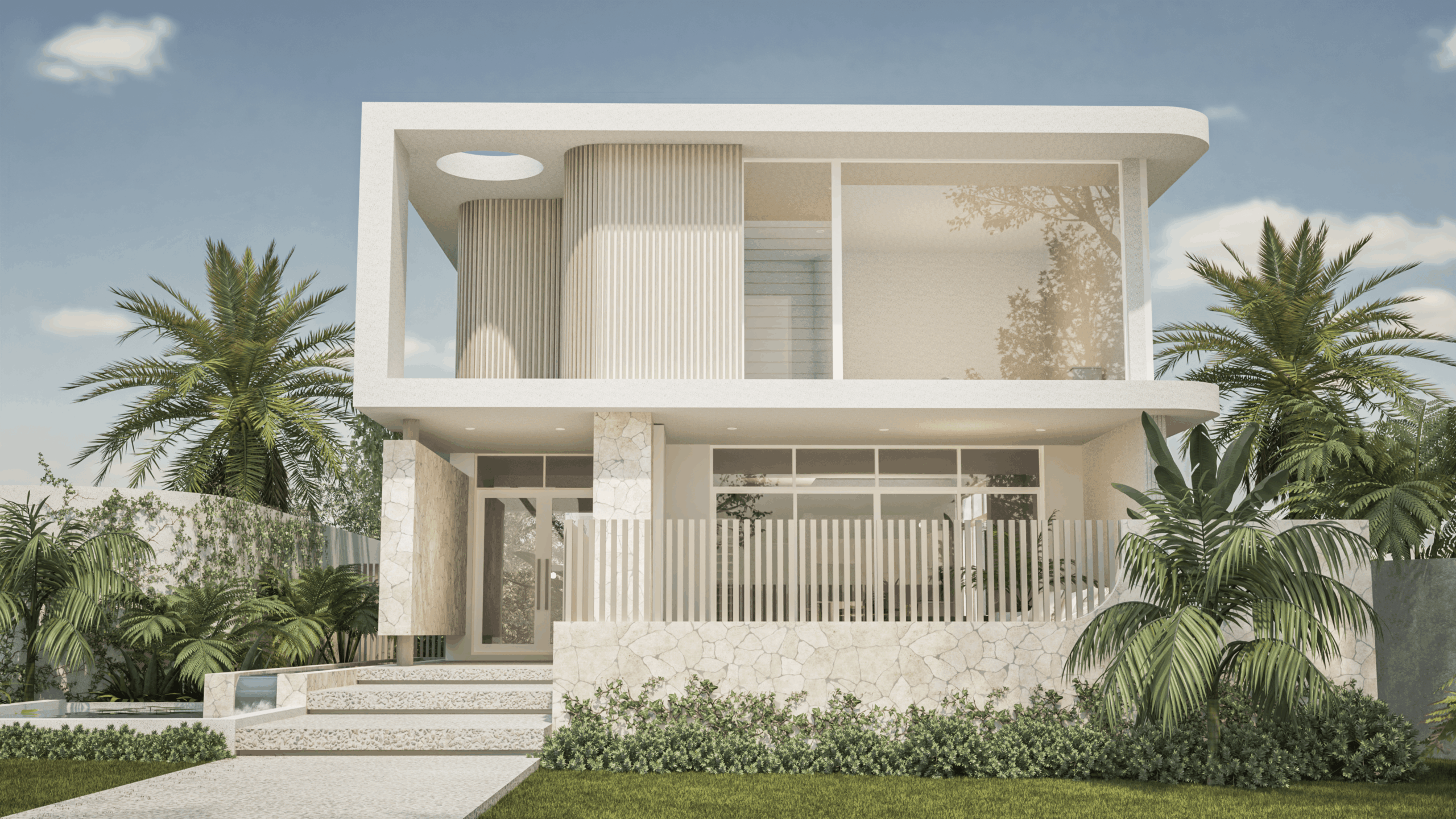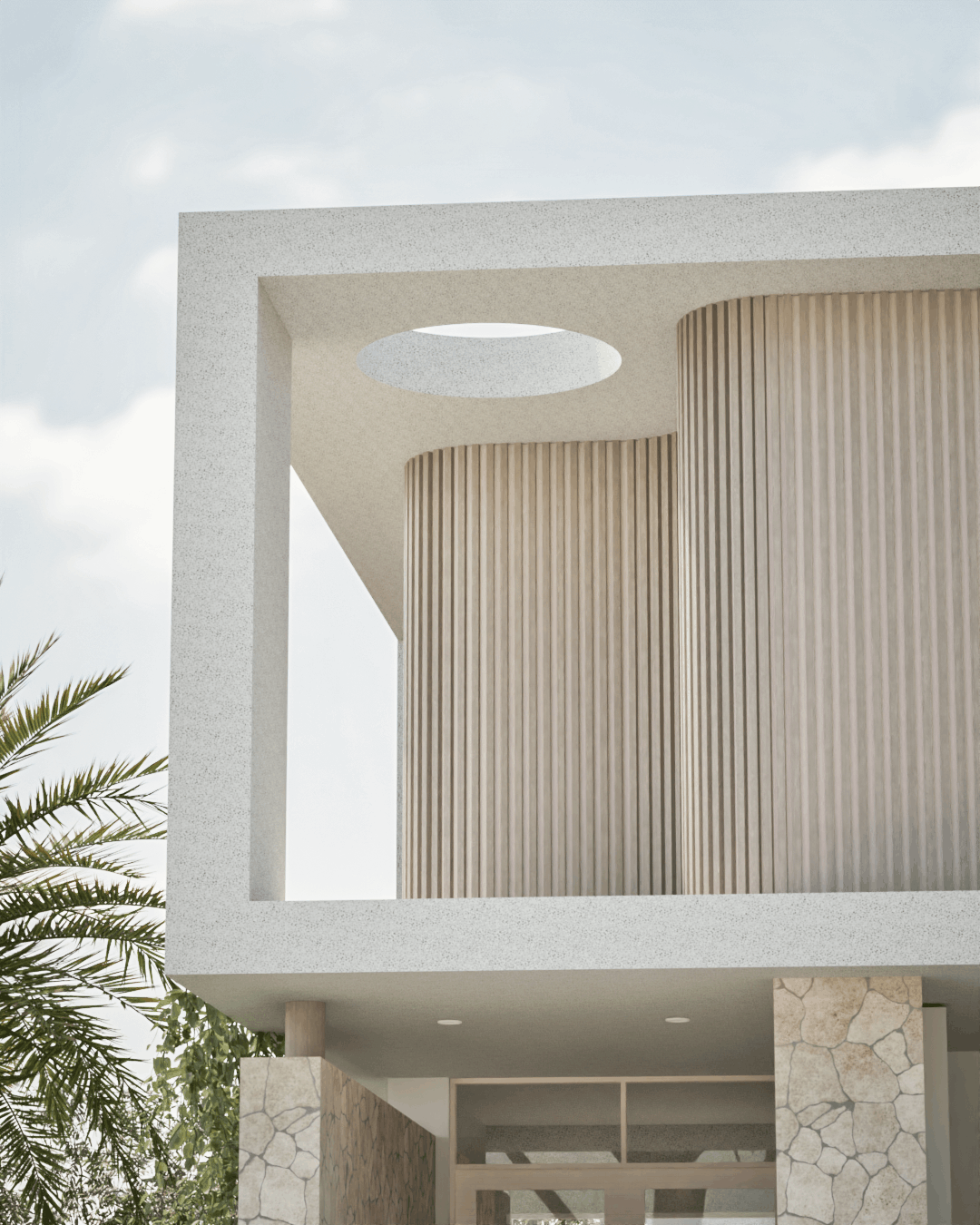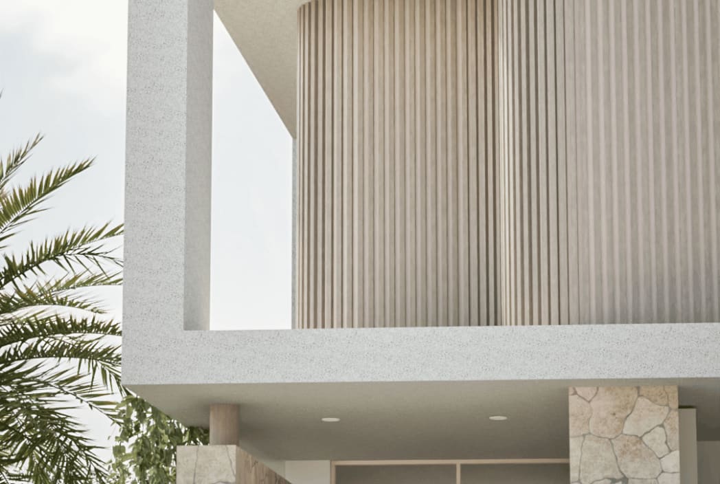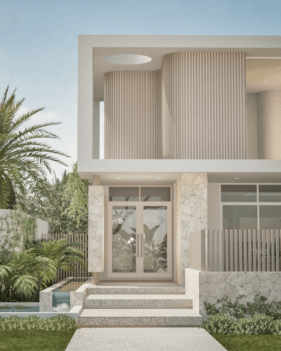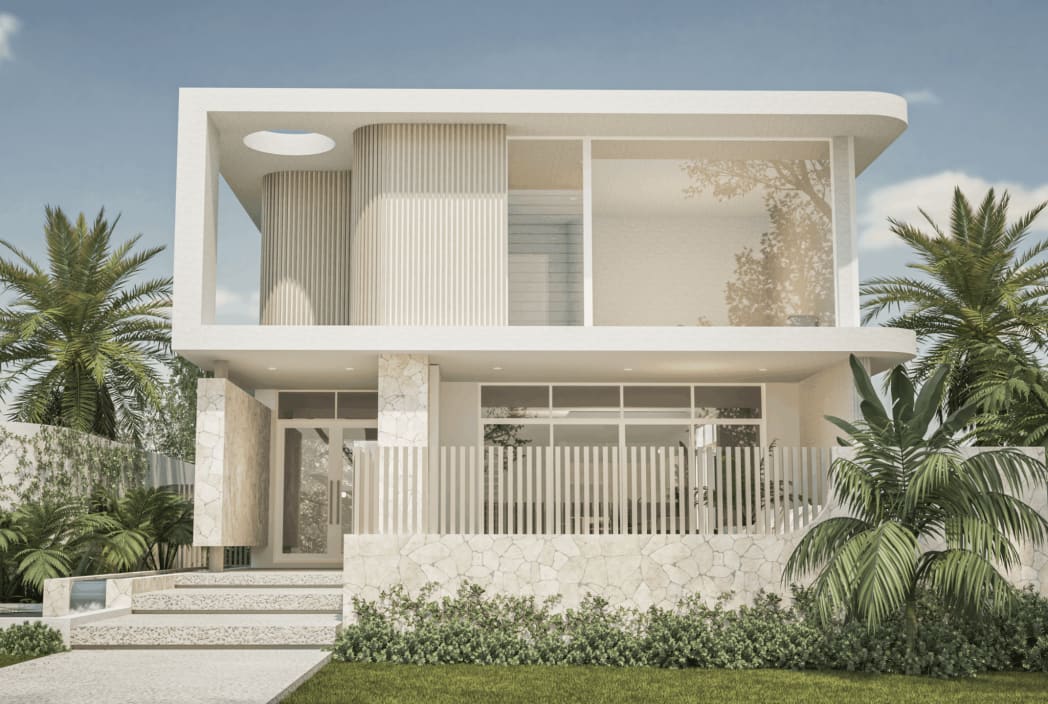 Upstairs, two minor bedrooms each feature an ensuite and walk-in dressing room, while a dramatic void overlooks the dining below. At the front, the parents’ retreat includes a generous master suite, dressing room and private office. Minimal and sculptural, the elevation pairs soft curves, timber battens and stone for a distinctly modern coastal presence.