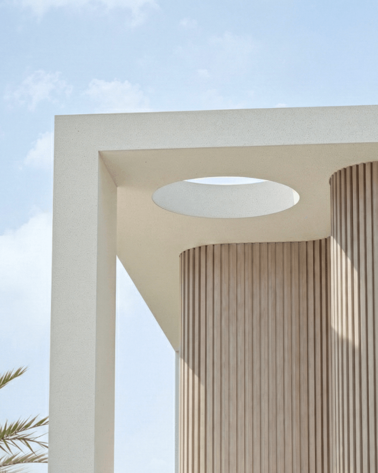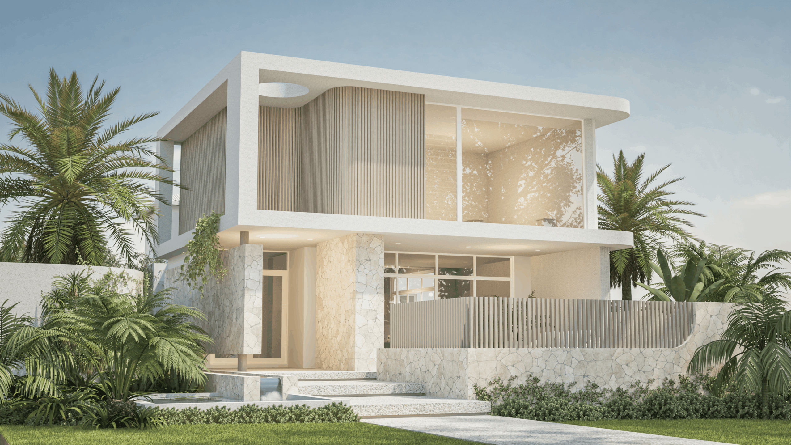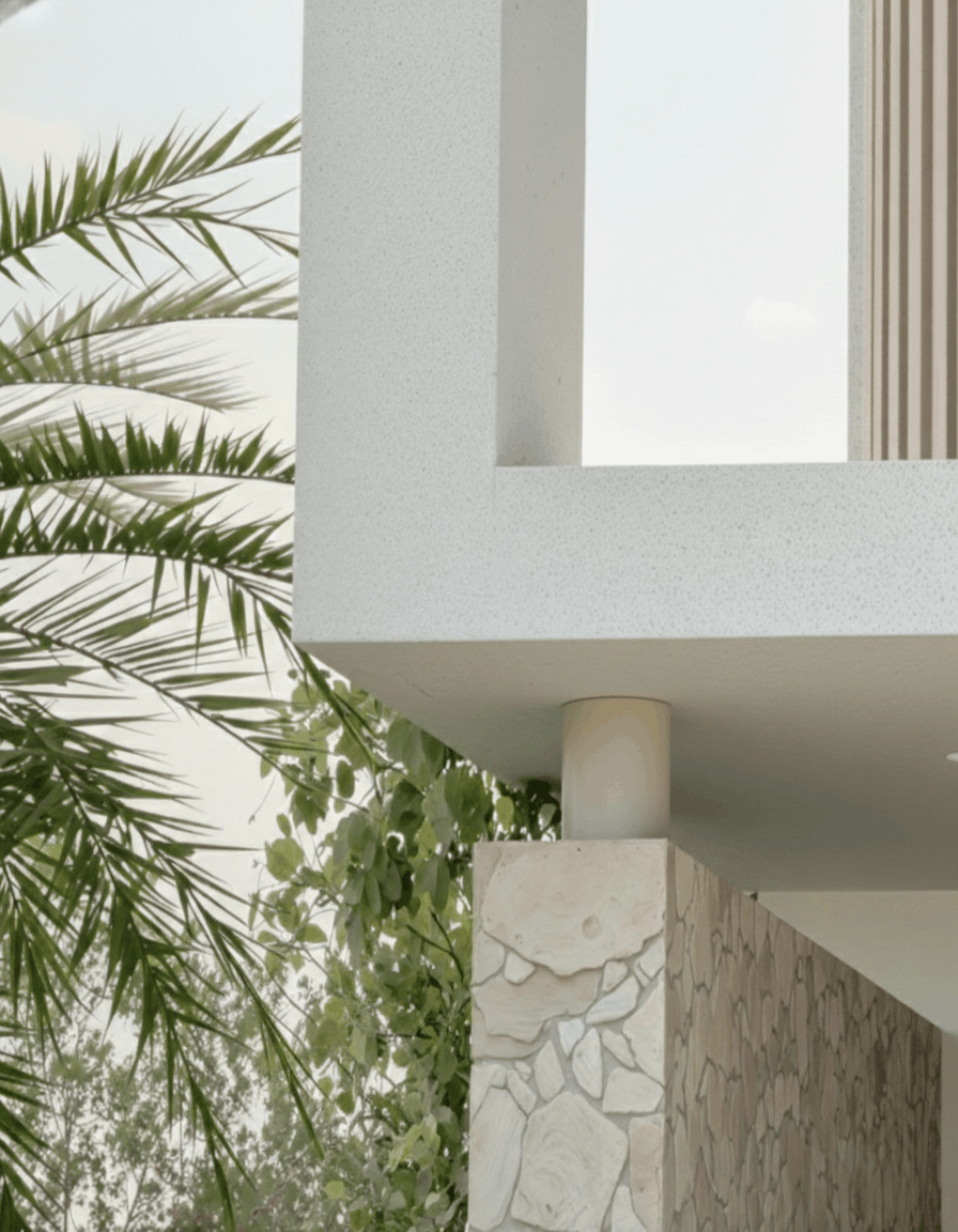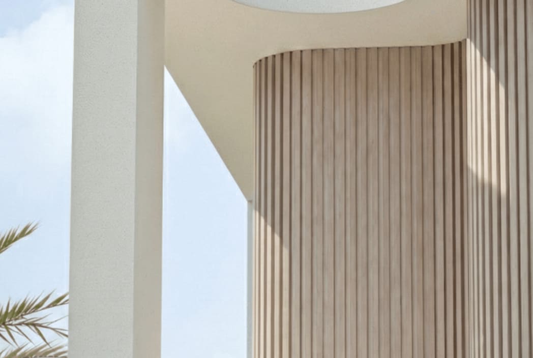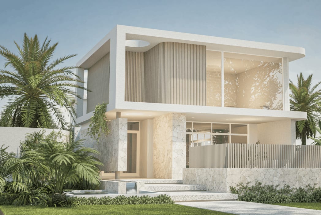Upstairs, two minor bedrooms each feature an ensuite and walk-in dressing room, while a dramatic void overlooks the dining below. At the front, the parents’ retreat includes a generous master suite, dressing room and private office. Minimal and sculptural, the elevation pairs soft curves, timber battens and stone for a distinctly modern coastal presence.