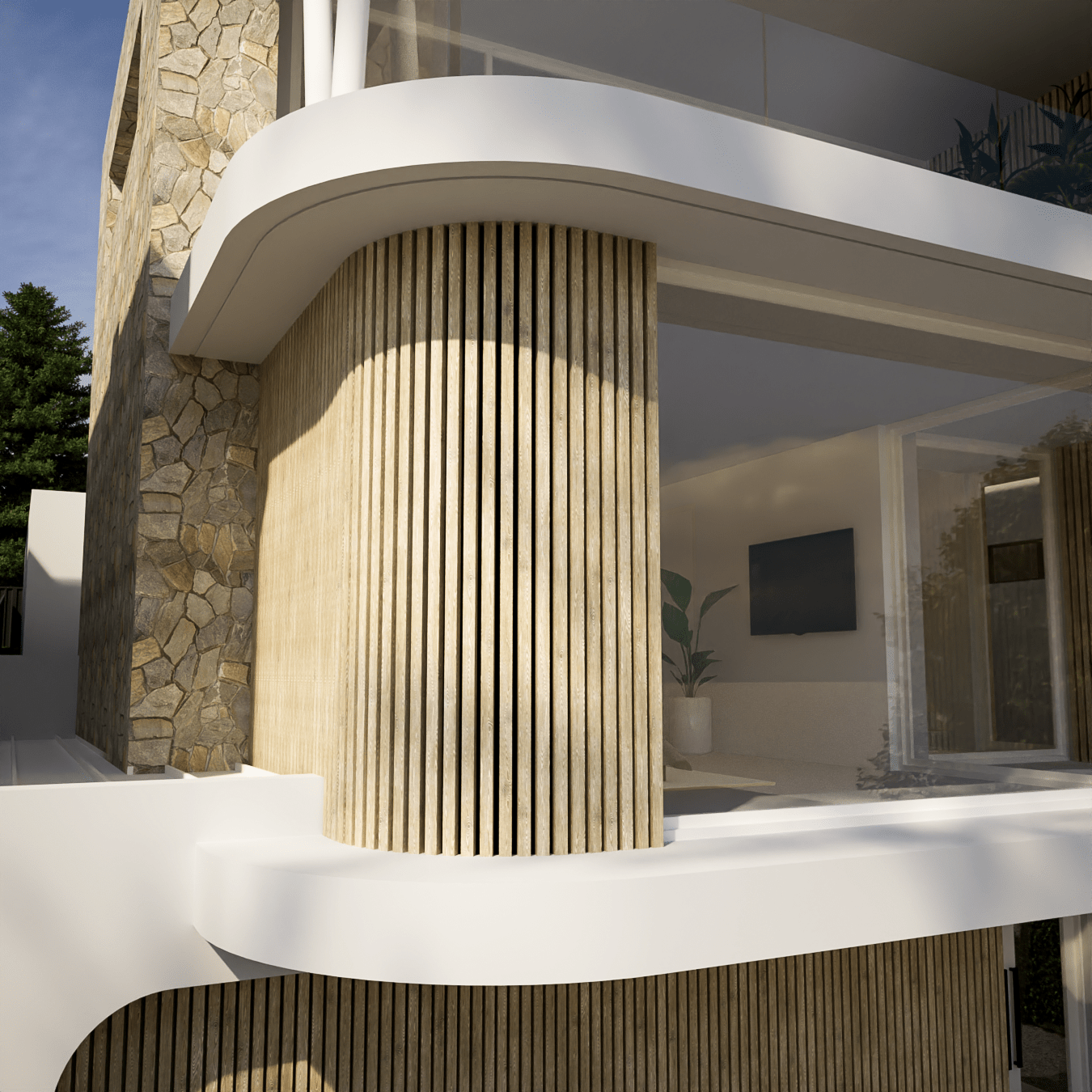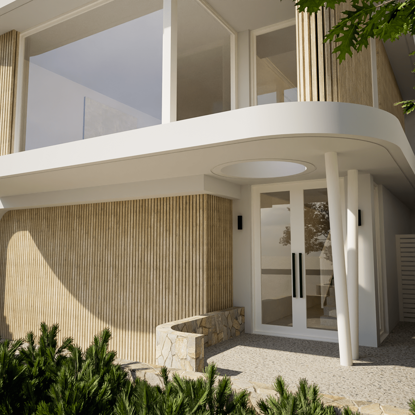Cleverly designed for a narrow block with a steep slope, the Scarborough concept rises across three levels, its elevation defined by soft curves, timber look aluminium cladding, a stone feature wall, and expansive glazing.